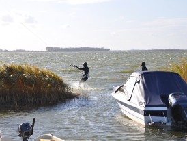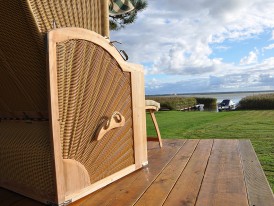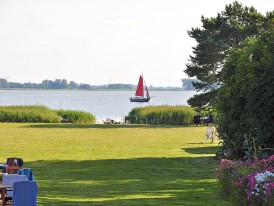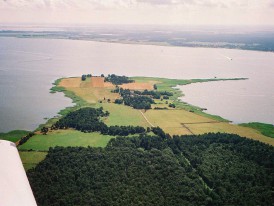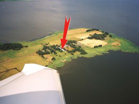 Luftaufnahme der Halbinsel Bliesenrade. Der Pfeil zeigt unsere Ferienwohnungen